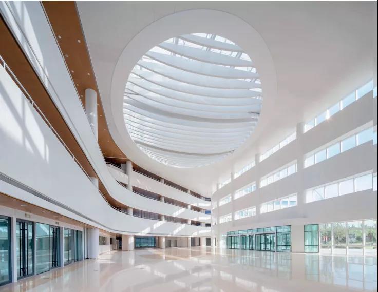 由于院區(qū)用地呈不規(guī)則的梭形,且用地處于西側(cè)城市主要交通與東側(cè)居住區(qū)的過(guò)渡區(qū)域,方案創(chuàng)新性地引入“城市客廳”的設(shè)計(jì)理念,用地中心位置的開敞共享公共大廳不僅作為與城市、居住區(qū)進(jìn)行空間對(duì)話的形象節(jié)點(diǎn),而且將整個(gè)院區(qū)各功能自然地整合在一起。